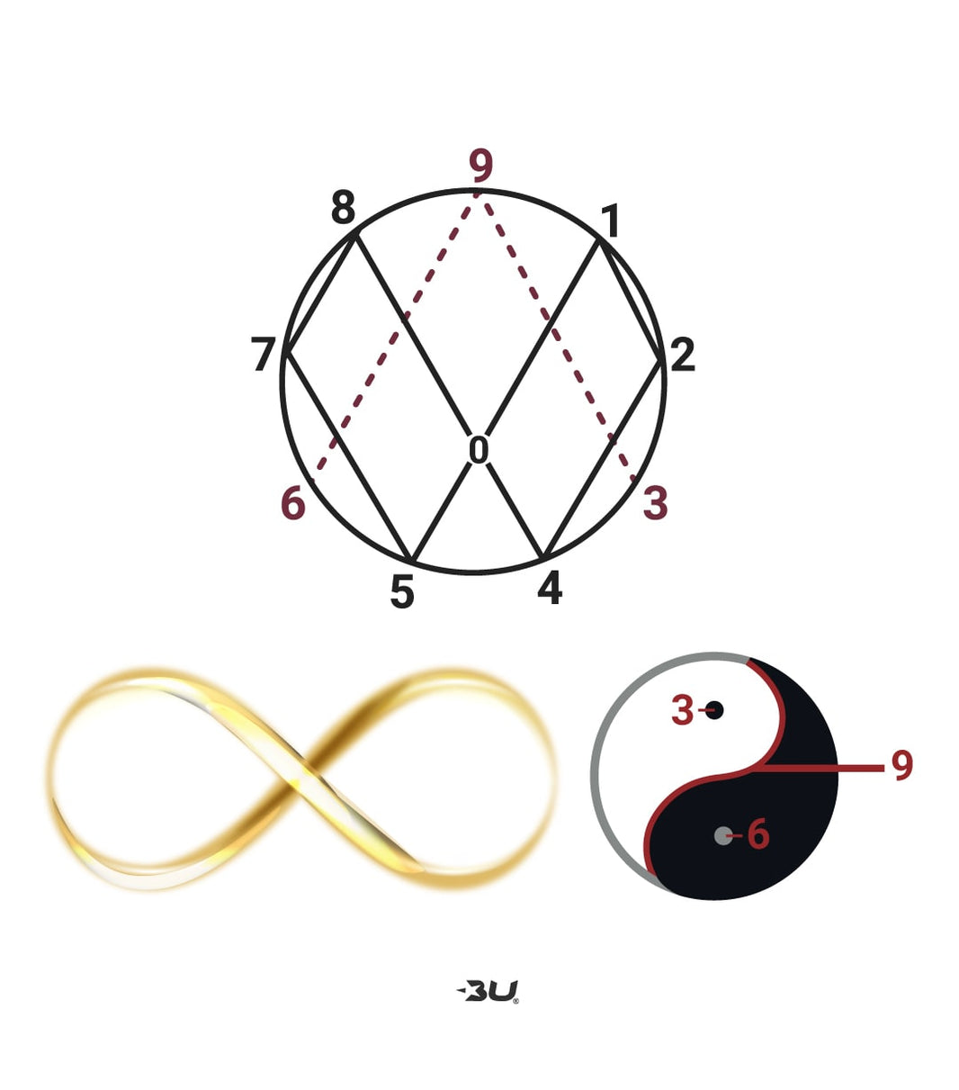 1 2 4 8 7 5 , 1 2 4 8 7 5 makes the the infinity symbol (look closer) 3 6 9 are outside of the pattern.